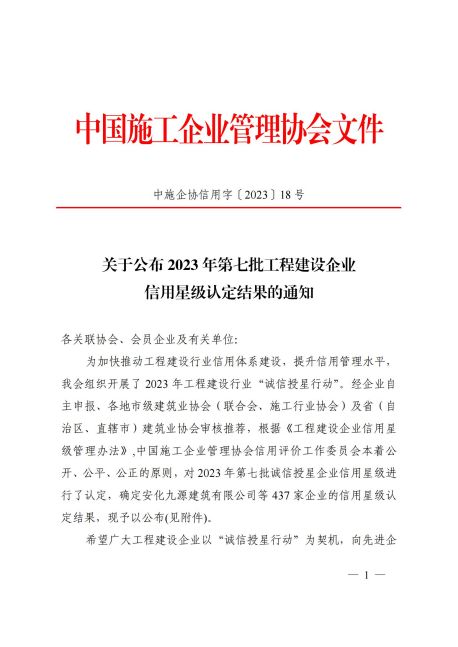 5月22日,中國施工企業管理協會信用評價工作委員會發布了2023年第七批工程建設企業信用星級認定結果名單,濱州城建被授予6星級信用企業。