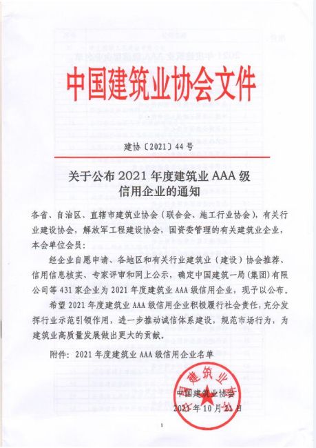 全國建筑業(yè)AAA級信用企業(yè)由中國建筑業(yè)協(xié)會(huì)篩選評定,是建筑行業(yè)信用最高獎(jiǎng)項(xiàng),旨在使守信企業(yè)充分發(fā)揮誠信自律示范帶頭作用,弘揚(yáng)誠信經(jīng)營的行業(yè)風(fēng)氣,切實(shí)提高工程質(zhì)量和安全管理水平。此次成功獲評是對公司誠信經(jīng)營、履約能力、企業(yè)信譽(yù)、社會(huì)責(zé)任等各項(xiàng)指標(biāo)的綜合肯定。